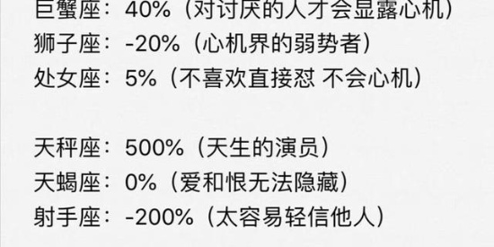 白羊座:2%(对人很真诚很少心机) 金牛座:50%(心机很多,擅长隐藏) 双子座:200%(永远不会表露真心) 巨蟹座:40%(对讨厌的人才会显露心机) 狮子座:-20%(心机界的弱势者) 处女座:5%(不喜欢直接怼,不会心机) 天秤座:500%(天生的演员) 天蝎座:0%(爱和恨无法隐藏) 射手座:-200%(太容易轻信他人) 摩羯座:30%(太爱自己) 水瓶座:1%(嗯 很佛系) 双鱼座:80%(看起来笨笨的,其实很有心机)